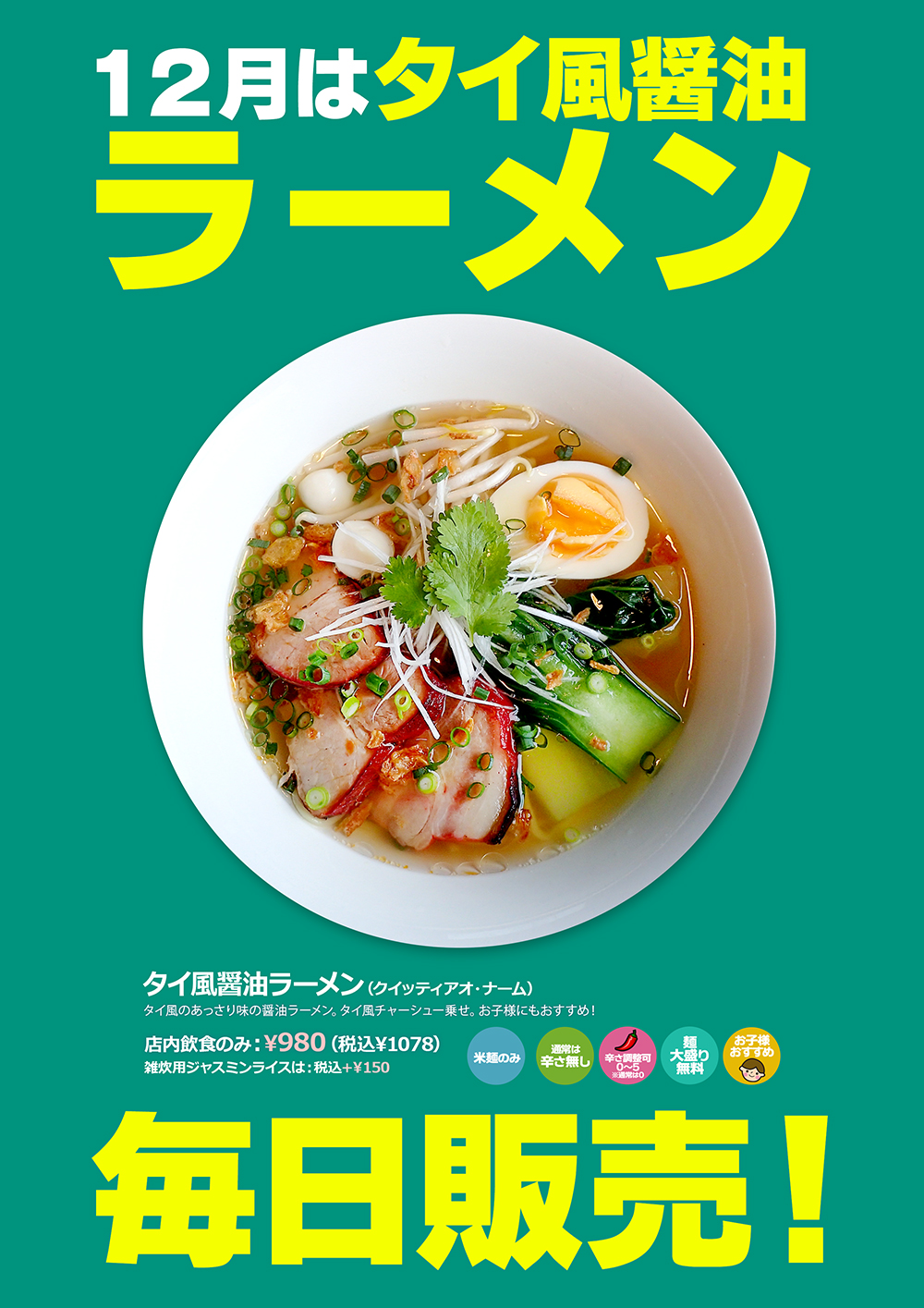12月は「タイ風醤油ラーメン」毎日販売!