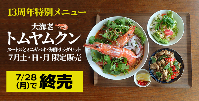 【13周年記念】「大海老トムヤムクンヌードルとミニガパオ・海鮮サラダセット」販売決定!