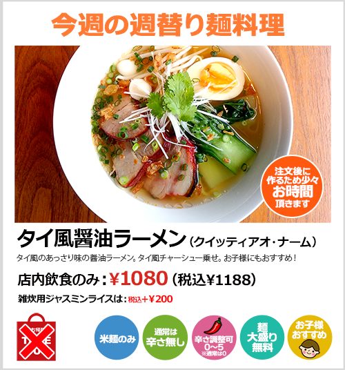 八角やシナモンの独特な風味で味付けしたタイ風チャーシューを乗せたタイ風の醤油ラーメンです。
